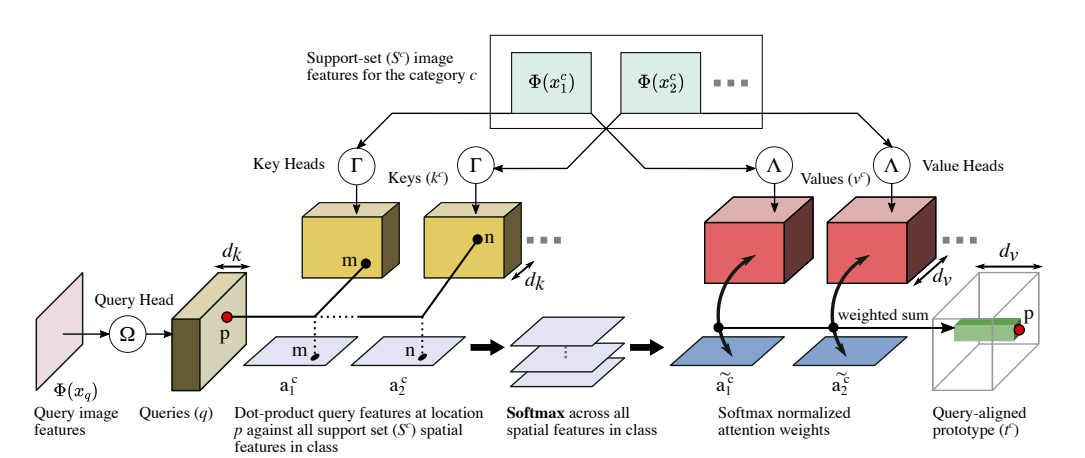 이제 key-value-query가 구해졌으니, dot-product를 통해 attention score를 구할 차례입니다. Attention score는 대략적 correspondence를 나타내며, support-set feature를 query에 맞게 총 정렬하도록 합니다.