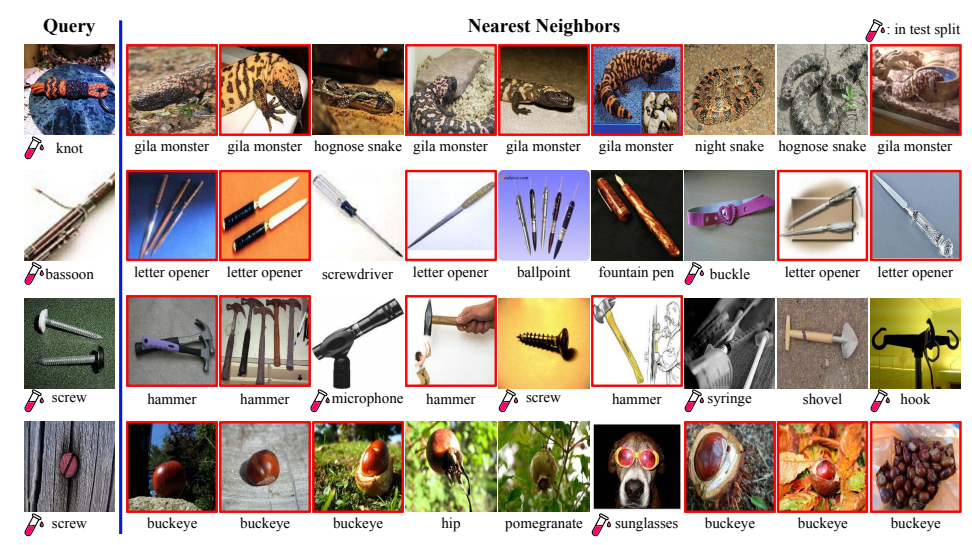하지만 위의 결과를 보면, 실제 이미지는 그렇지 않다는 것을 직관적으로 보여줍니다. 오직 유사한 representation을 가진 특징만으로 분류를 시도하면 5%만 Query의 class(label)와 일치하는 결과가 이를 말합니다.