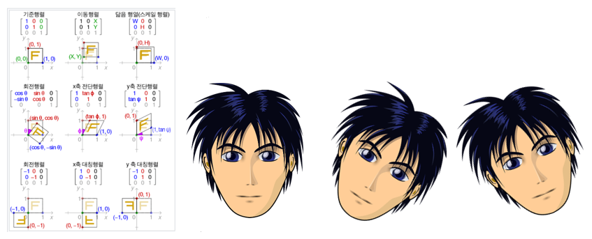 얼굴이 비스듬히 있는 것, 혹은 옆으로 있는 것, 등의 증명사진에서의 변형이 위 사진처럼 변환 행렬을 통해 표현이 가능한 것이다.