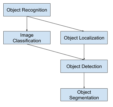 모델 명을 제외하고, <Recognizing Object>부터 살펴보자. 다르게 표현하면 object recognition으로 직역하면 “객체 인식”이다. Object Recognition은 Computer Vision 분야의분야의 주된 목적이자 목표로, 이미지 혹은 영상에서의 객체(사람, 자동차, 동물 등)를 말 그대로 “인식”하는 것을 말한다. “인식”은 다시 세분화되어, 단순히 “사람이다, 아니다”로 binary-classification “이진 분류”하는 방식과, “사람이다, 자동차이다”로 multi-classification “(세분화) 명명세분화)명명 혹은 다중 분류”하는 방식이 있다. 그리고 또 다른 인식 방법인 localization 객체의 “위치를 찾는” 방식이 있다. 이를 좀 더 깊게 들어가면, 이미지 혹은 영상 안에 어떤 객체들이 있는지, 어디에 있는지까지 detection “찾고 명명”할 뿐만 아니라, 이미지를 픽셀 단위로 낱낱이 segmentation “분해하고 분류 및 명명”까지 할 수도 있다. 본 논문에서는 이런 개념을 통틀어 사용하기 위해 task를 구체화하지 않고 <Object Recognition>이라는 말을 사용하였다.