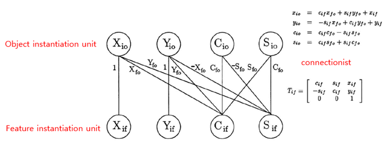 한 layer는 특정 feature를 표현하는 unit들로 구성되어 있고, 그 위의 layer는 object를 표현하는 unit들로 구성되어 있다. 그리고 한 feature는 총 4개의 instantiation unit을 갖는다. 각각 (x, y)-position, orientation, scale이다. 이 때, 변환 행렬은 cosine, sine, x-y position으로 구성된다.