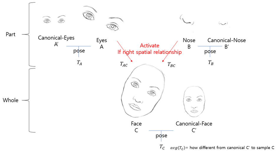 로 나타내면, T_C에 대한 prediction 예측이 가능하다. 또한, 이를 T_BC를 비교하여 적합하면, 이는 capsule-C를 activate 하기 위한 적절한 조건으로, capsule-A와 capsule-B가 알맞은 spatial relationship을 가지고 있다고도 볼 수 있다. 그리고 이렇게 예측한 T_C의 평균값은 sample-C가 canonical-C와 비교했을 때, 얼마나 transformed 되어있는지를 판단할 수 있는 지표가 된다.
